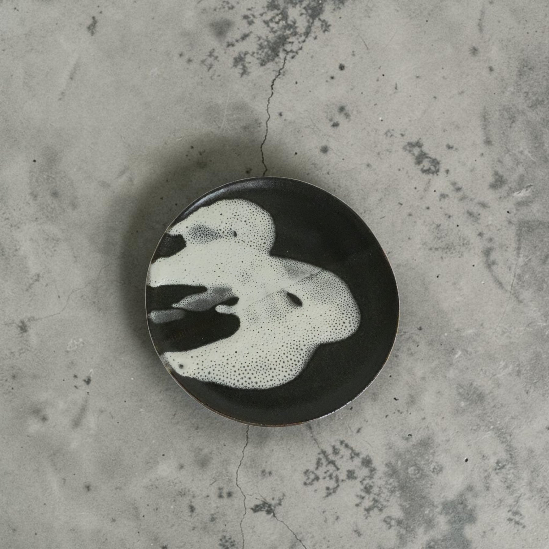目黒・八雲を拠点に活動する期待の若手陶芸作家、Lukeさんによるフラットプレート。 一切の無駄を削ぎ落とした平らなフォルムに、モノトーンの釉薬が描く有機的な模様が、モダンな美しさを放ちます。